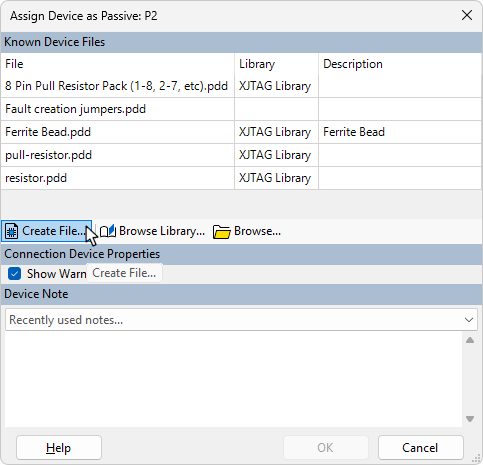 To create a new Passive Device Description file during categorisation, assign the device as Passive to open the Assign Device as Passive dialog box and click Create File...: