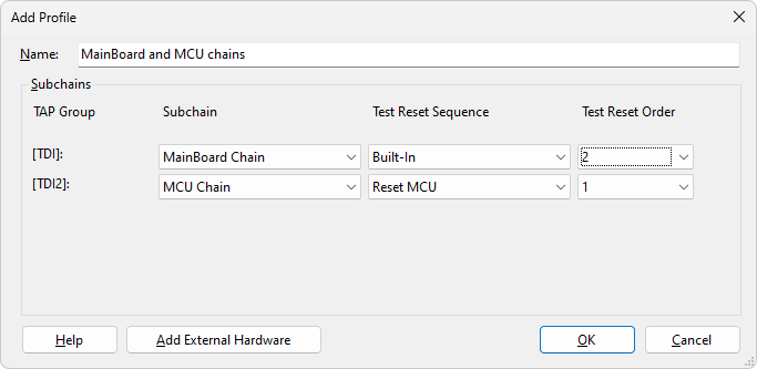 The system will also automatically create a profile called "All chains" which contains all of the subchains. The Test Reset order for this profile is the External hardware subchain, then the other subchains by increasing TAP group number.