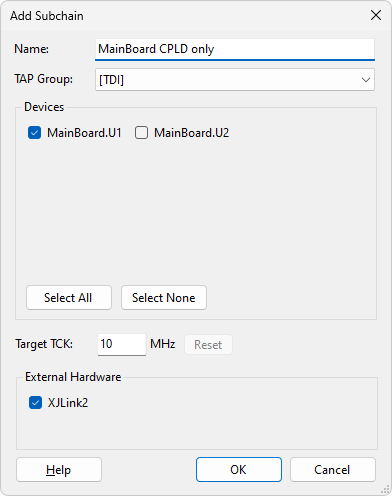 - When you configure a subchain, you need to select all available devices unless you are using a JTAG multiplexer.