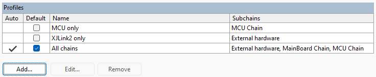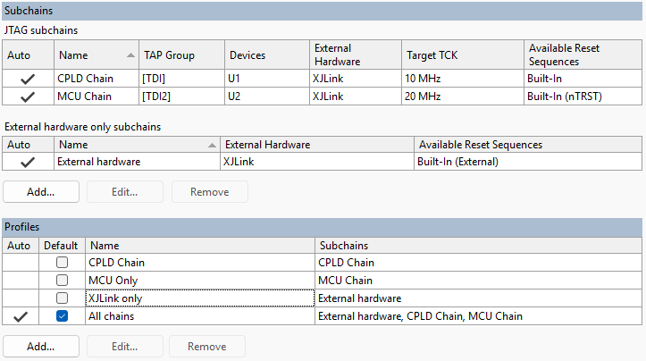 The Subchains table lists all the subchains in the project, while below that the Profiles table lists the profiles that have been set up. In this screenshot, several profiles have been created – one is the automatically generated All chains profile which accesses all devices simultaneously. The others are manually created profiles allowing access to each of the JTAG chains separately, or just the pins on the XJLink2 which are not acting as TAP pins.