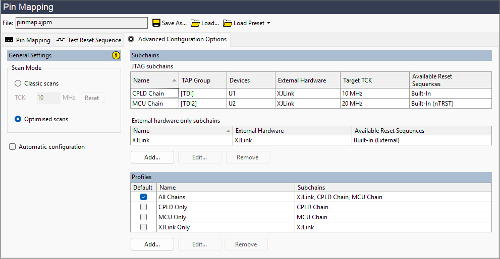 - Because dynamic chains need independent JTAG signals, XJDeveloper needs to know the TAP groups that are being used, and therefore profiles can only be configured after the project's pin mapping has been defined.