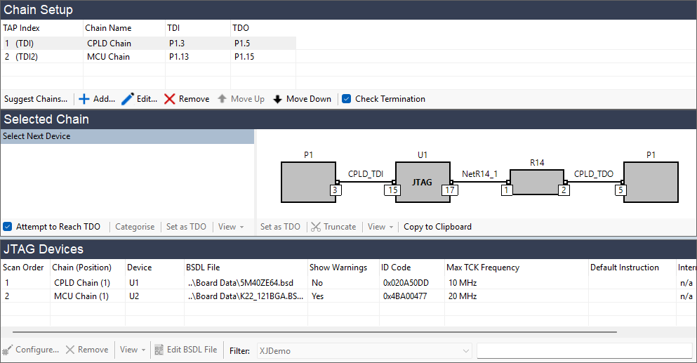 - The chain identification algorithm searches for a connector that could be providing the circuit's JTAG interface, and it expects to find the TDI and TDO signals coming to the same connector. If the JTAG interface is provided via test points, XJDeveloper will be unable to complete the chain because it will consider TDI and TDO to be on separate connectors. However, it is normally still worth using the automatic detection to provide the rest of the chain. The remaining parts can then be completed manually.