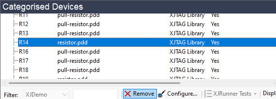 - The categorisation of a JTAG device can be removed in the JTAG Devices section of the JTAG Chain screen by selecting the device and clicking that section's Remove button.