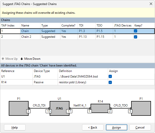 The middle section is used to categorise the devices that were found in the chain. In the above example, U1 is being suggested as a JTAG device, and R14 as a passive series connection. If any of these suggestions are incorrect, remove its tick from the Assign column.