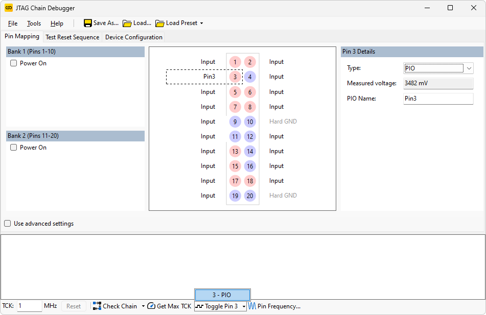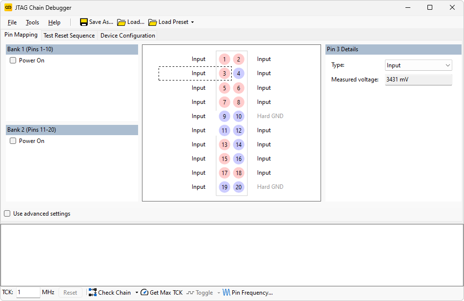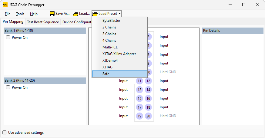 The first step of testing the JTAG cable is to use the JTAG Chain Debugger application (or the Pin Mapping screen in XJDeveloper) to measure the DC voltages on the lines: on the Pin Mapping tab, select the Safe pin mapping from the Load Preset dropdown menu. This will remove all pin allocations.