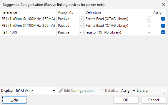 - In some circumstances, Links... may add devices that do not actually link power or ground nets to its list of possible linking devices (e.g. an RF circuit may include an inductor to ground where its non-ground pin is part of the active circuit rather than providing another ground net). Such devices can't be tested, so should be categorised as Ignored. This can be done while assigning linking devices by changing Assign As (Figure 6) from Passive to Ignored using the dropdown menu and leaving the tick in the Assign box. Doing so at this stage will remove them from the list of suggested linking devices, making it clearer which devices still need to be assigned.