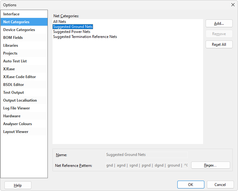The text that XJDeveloper searches for when attempting to identify power, ground and termination reference voltage nets can be modified to suit user-specific nomenclature: open the Options dialog from the Tools menu at the top of the screen and select the Net Categories tab as shown in Figure 11: