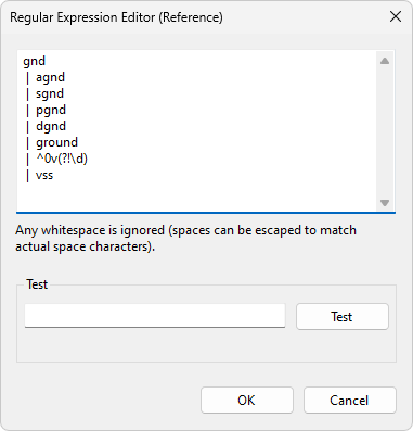 The Regular Expression being used can be edited by clicking in the main box (1). Once it has been changed to suit the nomenclature in the user’s circuit, it can be checked by entering a string into the Test box (2) and clicking the Test button (3).