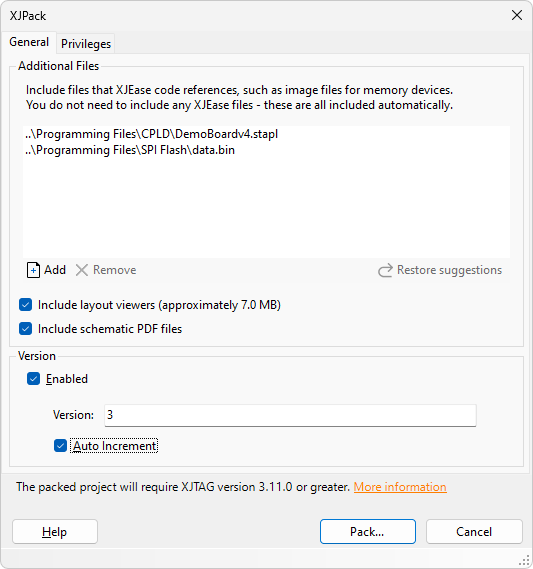 Once the paths to any additional files have been added and you have set the options for adding schematics and layout data, and configured any version numbering requirements, the XJPack file can be created by clicking the Pack... button at the bottom of the XJPack dialog box.