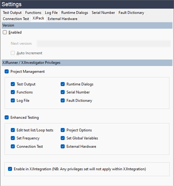 However, when an XJPack file is created, it is possible to block access to particular settings within a group (or a complete group) so that they can't be adjusted, even if the user's XJRunner access level would normally allow it. For instance, the ability for any user to override the TCK frequency can be removed from the options in the Enhanced Testing group.
