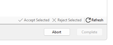 At the bottom of the window, you have buttons to Accept Selected or Reject Selected items. You can select multiple items in the list by using the standard Windows shortcuts – hold Shift to select a range, hold Ctrl to select multiple individual items or press Ctrl + A to select all items. If the selection has items which can be accepted in multiple ways, a dropdown arrow will be displayed, turning the button into a menu.