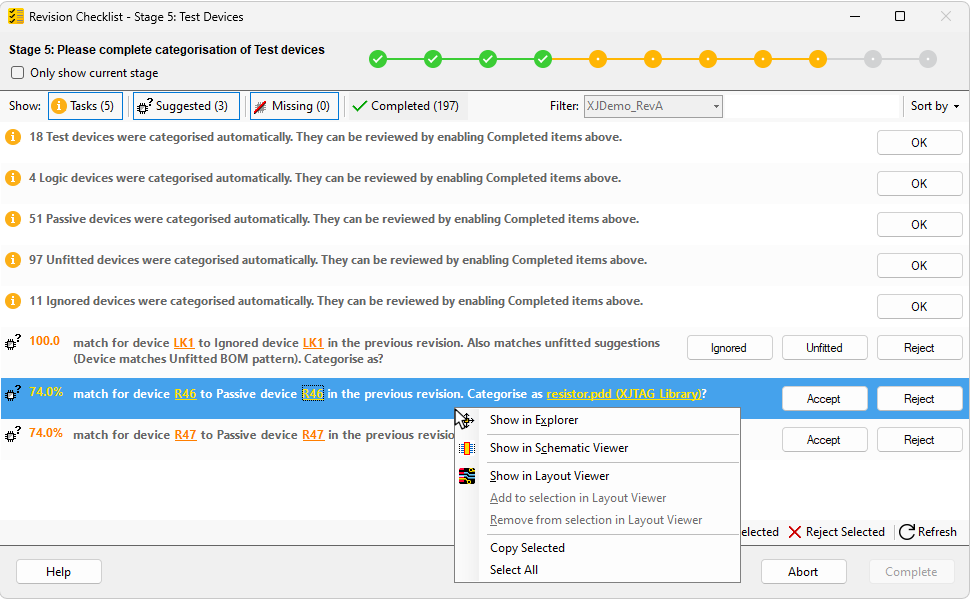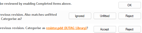 The aim of this process is to map as many categorisations as possible to the new revision. The Revisions wizard will complete much of this process, meaning that many of the changes will be categorised automatically, especially if they are minor changes such as reference designators or resistor values. That said, there are likely to be a number of places where some user input is required. The Revision Checklist will guide you through this process as quickly and easily as possible, giving you the information you need to ensure all the changes are correct.