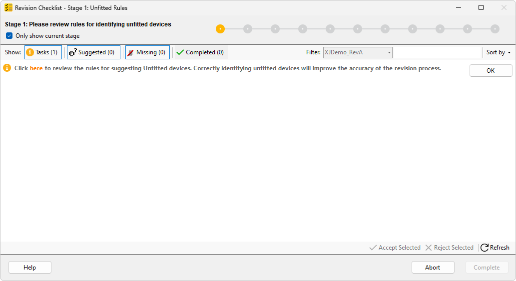 - Unfitted Rules - this stage involves checking how unfitted devices are identified, and ensuring that the rules are correct for the BOM data used for this revision.