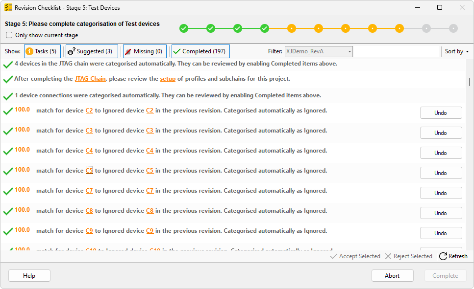 The Revisions process is split into a number of stages to help you run through it in a logical order, without missing anything. All of these stages are equivalent to the steps that would have been worked through when configuring a project in XJDeveloper, however because the system has a previous version of the project to use as a template, a lot of the devices and nets will have been identified already, making the process much quicker and easier for you.