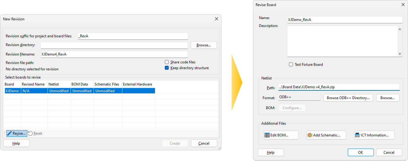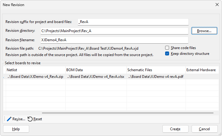 To get started creating a revision, use XJDeveloper to open the existing project that the new revision will be based on. At this stage, you need to tell XJDeveloper where to save the revised project, whether the test device files are to be shared and how to import the data files (netlist, BOM and schematic) for the new revision.