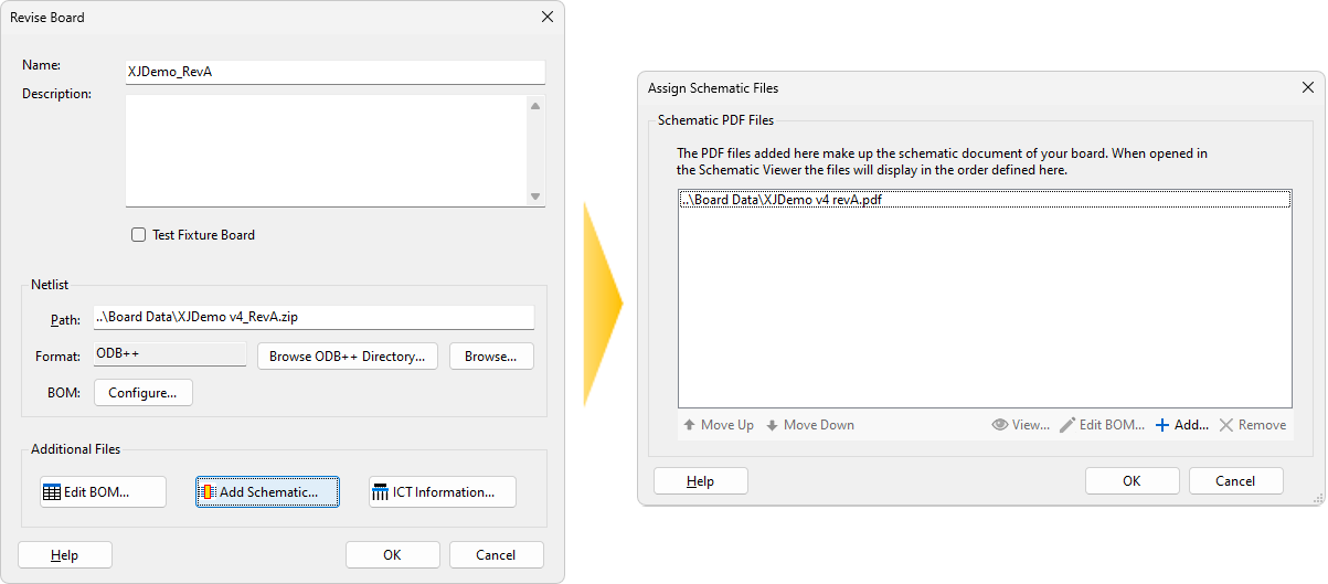 In the Assign Schematic Files dialog, use the Remove button to delete old schematic files and the Add... button to import their replacements. If the schematic contains BOM data, you will be asked if you want to use it – generally, you will say no here if you have a separate BOM file, because the BOM is likely to be more complete, accurate, and up to date. This is covered in more detail in the Entering Board Information user guide.