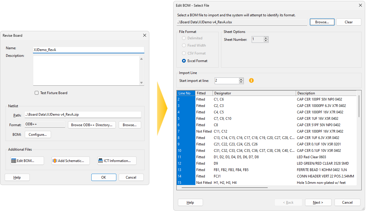 - It's important to ensure that the structure of the BOM data matches the previous revision as this data has a large influence on matching the devices on the boards later, regardless of whether this is a strictly accurate assignment of the data. For example, part numbers and component values should be in the same format as before.