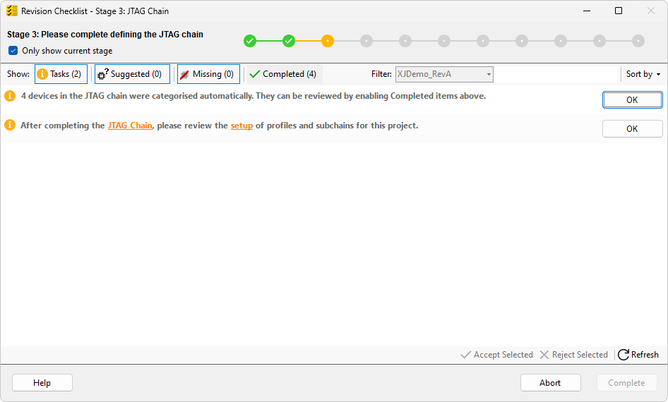 If any parts of the JTAG chains have changed, these will appear in this stage and should be dealt with first. If any changes have been made to the JTAG chains by adding, removing or moving JTAG devices, these can be configured through XJDeveloper by going to the JTAG Chain screen – the same way the chains were configured during initial creation. Once the JTAG chains are configured, review the profiles and subchains. If you have made any changes, click Refresh to update the wizard.
