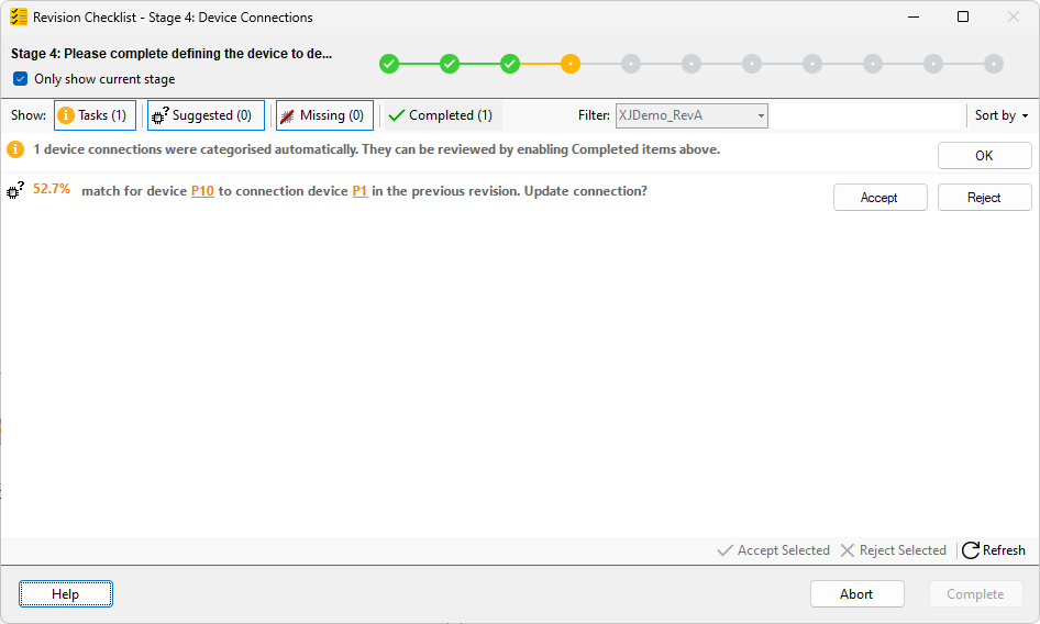 The next step involves checking connections between devices or boards and will frequently be automatically skipped if Revisions doesn’t find any changes. As before, the system will prompt you with any changes it has found but needs to check.