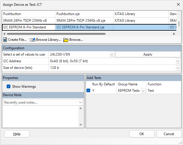 If a constant will always have the same value irrespective of how a device is used in a circuit, the simplest approach is to hardcode its value in the relevant XJEase file. For example, the page size of an I2C memory will never change and so can safely be hardcoded into the test device file. However, the same device may have an I2C address that is configured via its pins. In that case, the constant defining the address in the test device file may need a different value depending on how the device is connected in the circuit.