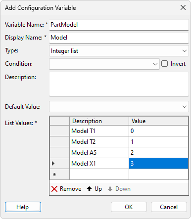 Two types of list can be created for Configuration Variables – one that sets an integer value and one that sets a string variable. In both cases, the process is as follows: