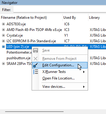 Now that the test device file has been given a Configuration Variable, a value can be set for each device that uses it. This means, for example, that in a circuit that uses several similarly-configured LEDs, the software can be told the colour of each one. This can be done in either the Categorise Devices screen or the Test Device Files screen: highlight the devices that use the same device file, right click, and select Edit Configuration... as shown in Figure 30.