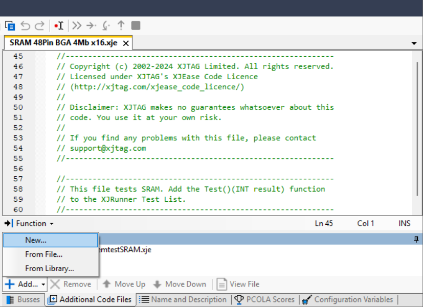 - The additional code files supplied by XJTAG are free for users to copy as the basis of their own files (but please refer to www.xjtag.com/support/xjease_code_licence for copyright conditions). If a file similar to what you need is available, it can be easiest to copy/paste part or all of the existing file into the blank file you have created and then edit it to create the new one.