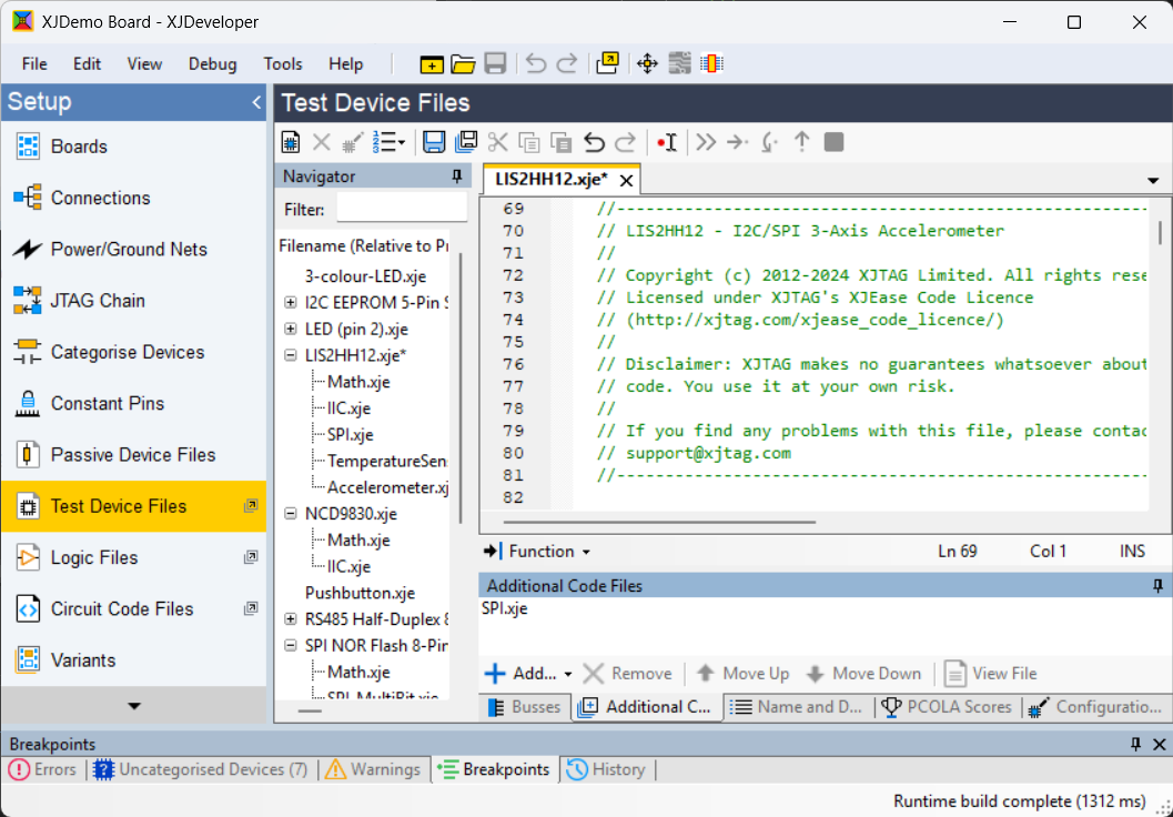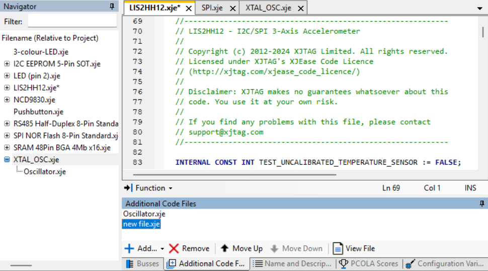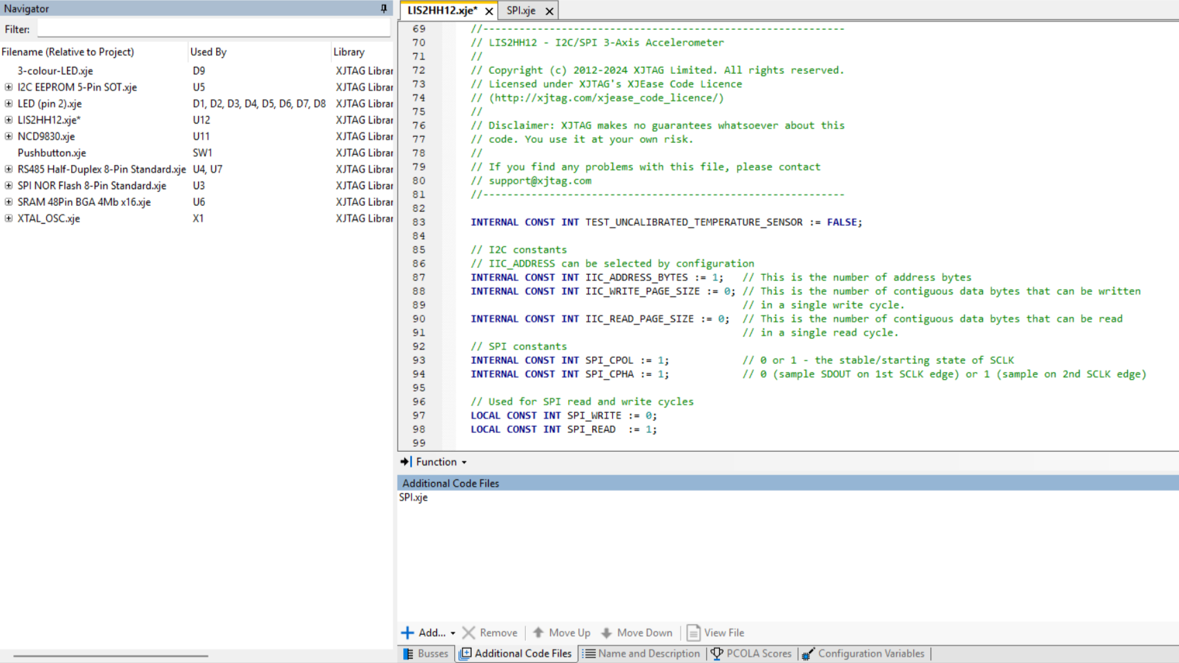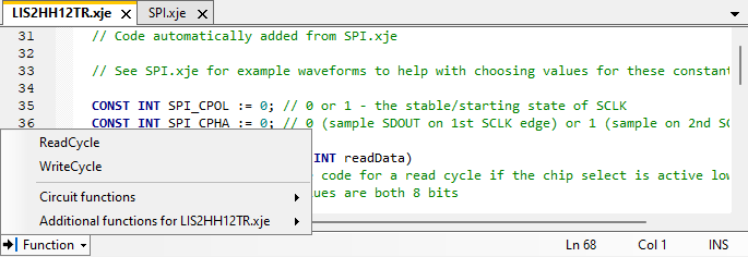 Continuing with the example above, the file SPI.xje has been selected because that is the additional code file that contains functions that read and write on the SPI bus:
