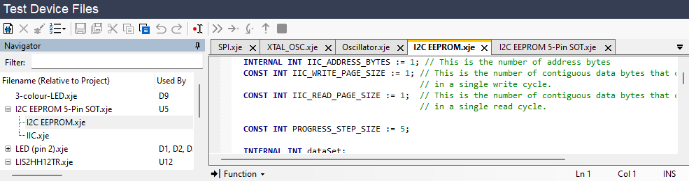 If a value is never going to change for all devices that use the file, the simplest approach is to hardcode the value for the constant. This can be done by copying the required lines of code from the additional code file's comments and pasting them into the code editor window for the test device file. In the example below, an I2C address is being set as well as various page sizes. The code has been copy/pasted from the comments in the IIC.xje file:
