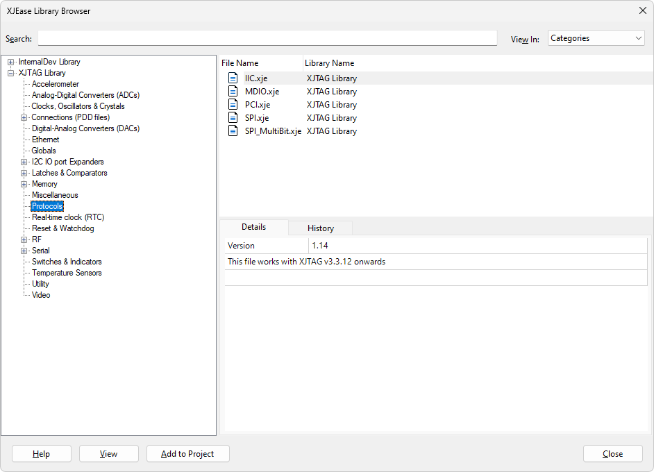 To add the required additional code file, highlight its filename and click Select as shown in Figure 20. To check which functions it contains before adding it, click the View button while the file is highlighted. This will open a file viewer. XJTAG Library files list their available functions in comment text at the top.