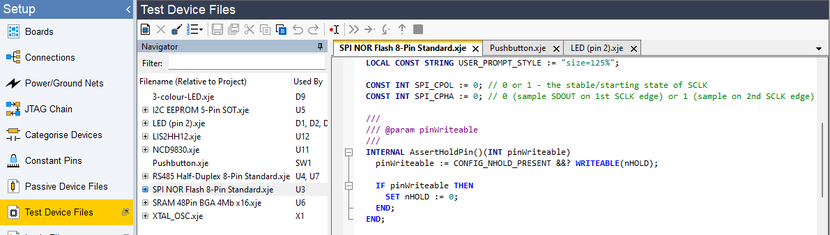 A device file is effectively a model of the type of device it is describing, and any test code in that file is intended to test that type of device in whatever circuit it is used. It is therefore circuit-agnostic. This simplifies the creation of boundary scan tests because these generic files can be used in different projects without having to be edited. If it is ever necessary to test something that’s specific to a particular design, a "circuit code file" should be used instead.