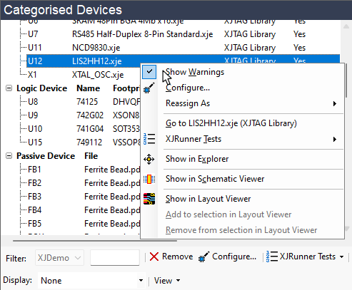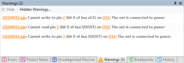 Some ICs support multiple interfaces—for example, a device may have an I2C bus as well as an SPI. XJEase library files for such devices are designed to accommodate either interface; when used in your project, the unused interface could cause warnings if some of its pins are not accessible in the circuit. In that example, it is safe to hide those warnings (see below on how to do that).