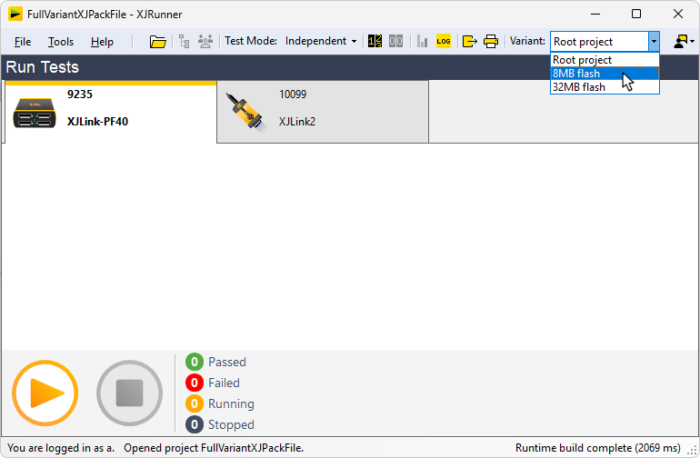 Run Tests screen), the Variant dropdown menu in the tool bar allows you to select which variant to run: