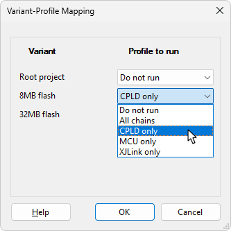 When the project uses profiles, clicking Select Profiles... will open the Variant-Profile Mapping dialog instead. To disable the test in a particular variant, select Do not run from its dropdown menu: