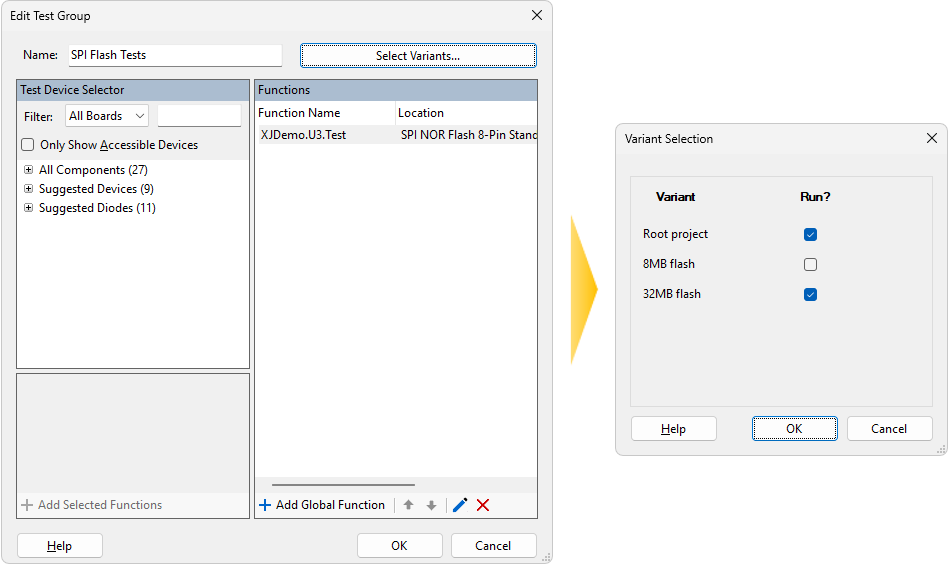 A test list only exists in the root project and must therefore include all the tests used by the variants, even if they are not applicable to the root. Once the variants have been defined, the test list will probably need updating to tell XJDeveloper which tests to run in each variant. For example, if device U12 isn't fitted in Variant A, the software will need to be told to exclude U12's test when running that variant.