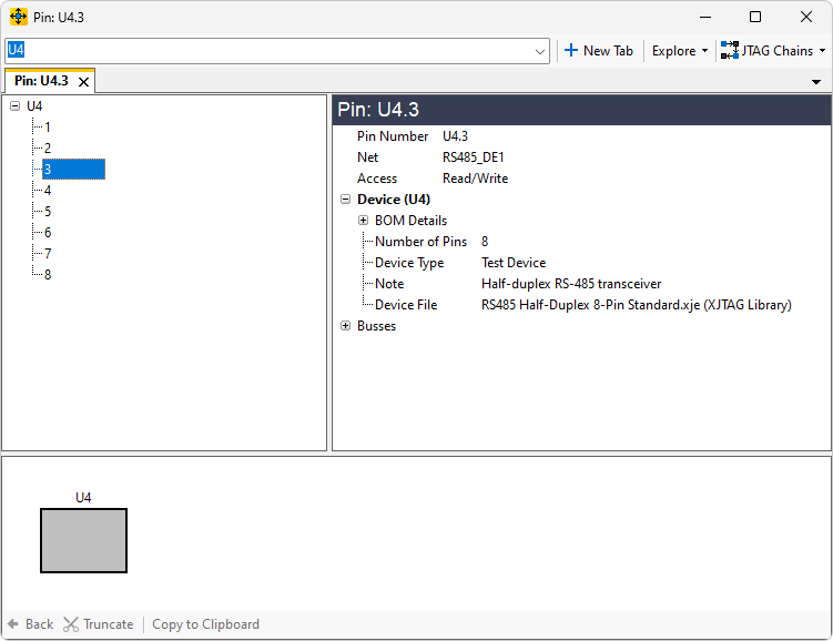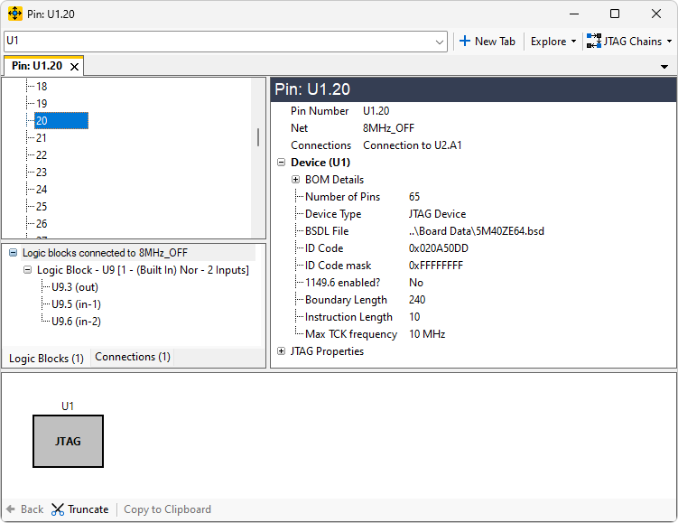 - If on a JTAG device, details of the pin's boundary scan cells and their capabilities