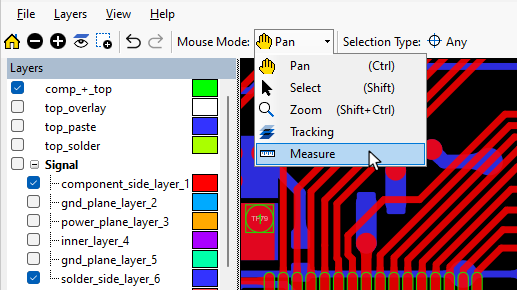 Measurements between items on the layout can be made by switching the mouse mode to Measure using the Mouse Mode: menu as shown in Figure 26.