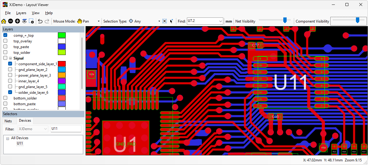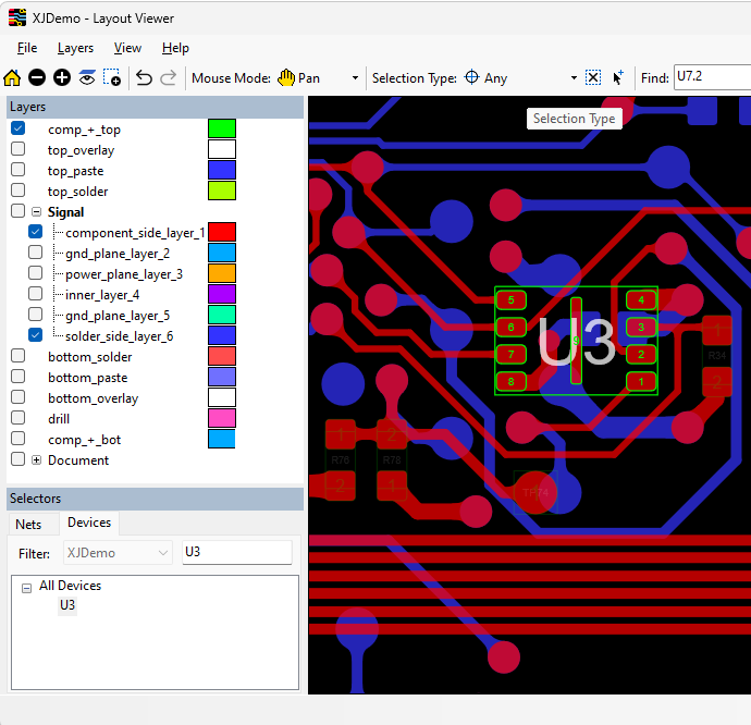 - select Tools > Layout Viewer > Select from XJDeveloper's menu bar and choose Device..., Pin..., or Net...