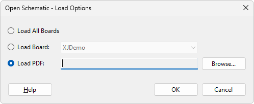 Load a schematic for a board that isn't in the open project. | Click the Load PDF: radio button and use Browse... to select the required file. | A schematic loaded in this way rather than as part of the project will not have the netlist search facility. |