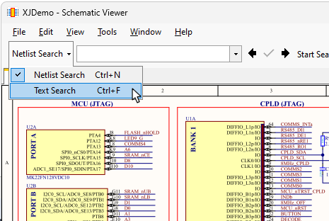 The Schematic Viewer's search facility has two options – Text Search and Netlist Search. They are selected from the dropdown menu beside the search box as shown in Figure 19. The text search will search for any text in the schematic, whereas the netlist search is limited to information found in a netlist (net names, device references, and pin numbers).