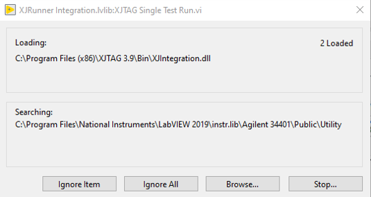When 64-bit versions of software are being used, XJIntegration.dll will be stored in the 64-bit Windows directory structure. However, when loading projects that were created using 32-bit LabVIEW (such as the XJTAG examples), LabView will search for XJIntegration.dll in the 32-bit directory (Figure 1) and will therefore be unable to locate it.