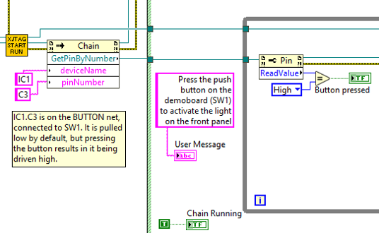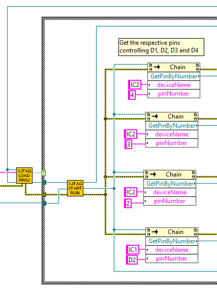 In LabVIEW, StartRunning.vi (a sub-VI of the XJTAG Write Pin.vi example) can be used to do this as shown in Figure 13 below. This VI creates a ChainRunner instance using the provided AnalyserProject and XJLink refnums and starts the chain running. It returns 2 objects: