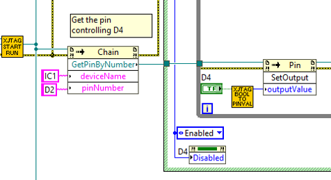 var chain = chainRunner.Chain; var pins = chain.GetAllPins(); var devices = chain.Devices(); var pin1 = chain.GetPinByNumber("IC1", "A1"); var pin2 = chain.GetPinByNumber("IC5", "3"); pin1.SetOutput(PinValue.High); // set pin A1 of IC1 high var readValue = pin2.ReadValue; // read the value of IC5 pin 3.