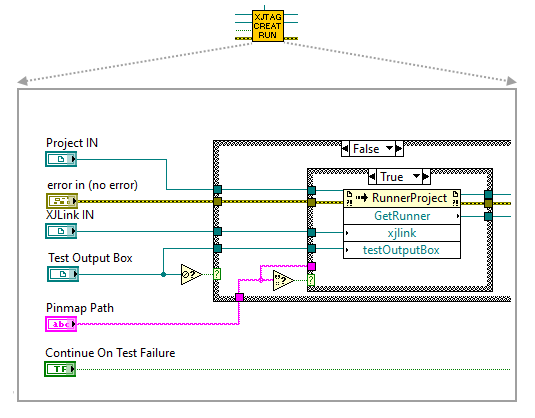 In LabVIEW, this is done using the CreateRunner.vi, as shown in Figure 7 (taken from the example XJTAG Single Test Run.vi):