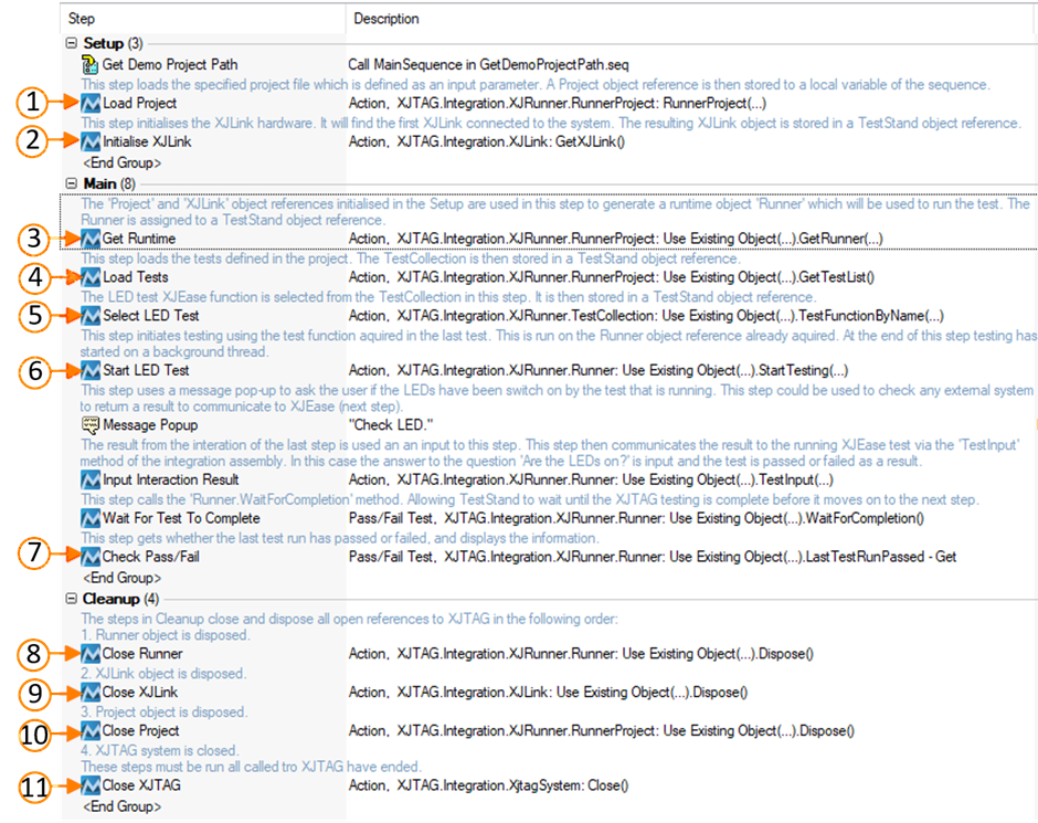 The TestStand examples that demonstrate how to use XJRunner Integration in .NET modules can be found in \XJIntegration .NET Examples\XJDemo V4 Examples\XJRunner\TestStand\DotNET. The sequence file XJRunner .NET Integration.seq, which comes as part of the standard XJTAG installation, is shown in Figure 12 below. In the below example, an LED is tested by calling the standard XJEase test. The sequence of steps is as follows: