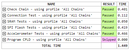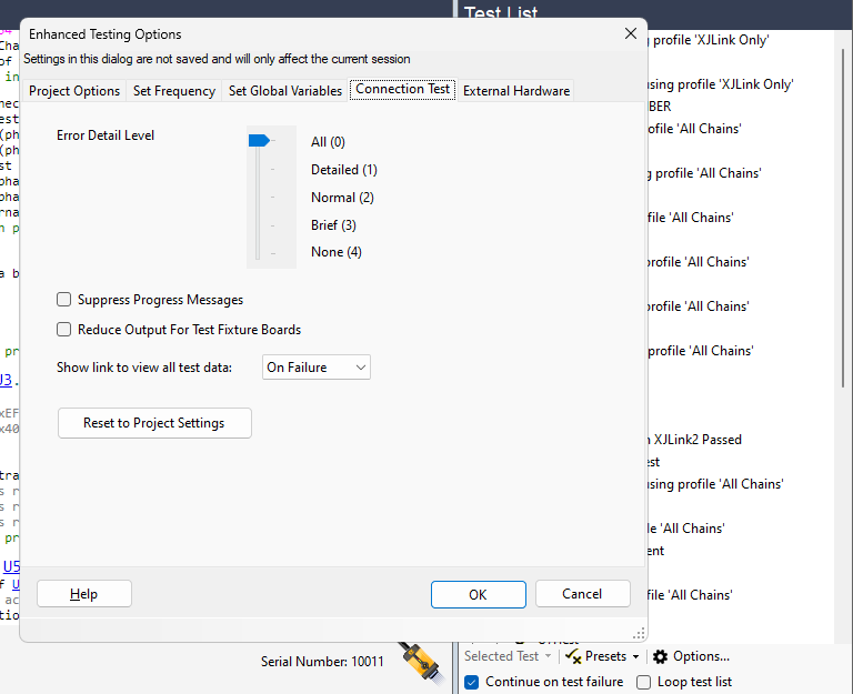 There are two additional configurations that can be used to reduce the amount of data presented: one that suppresses progress messages during the Connection Test, and another that limits the displayed data for test systems that include a test fixture board.
