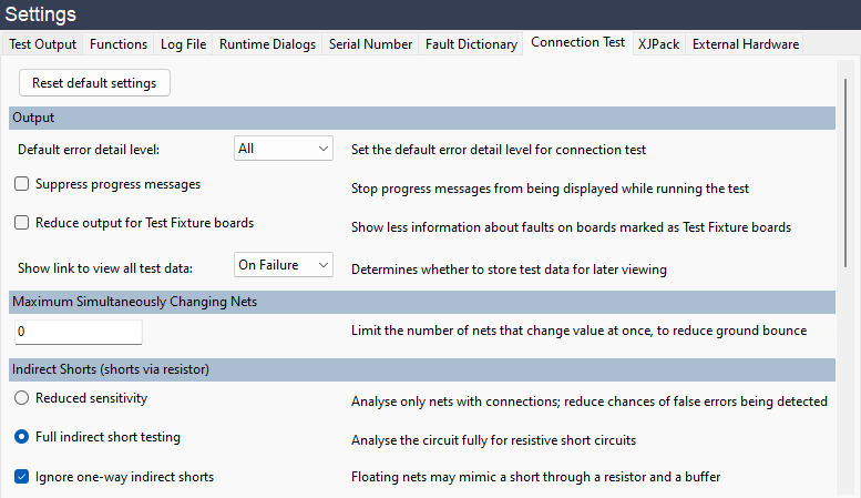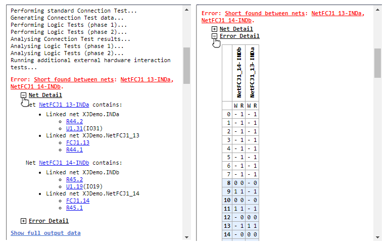 If Detailed Test Output has been enabled and Connection Test fails, information about the failing test will be displayed. By default this includes both Net Detail (a list of pins on the affected net) and Error Detail (a table showing the write patterns used on the affected pins and what was read):