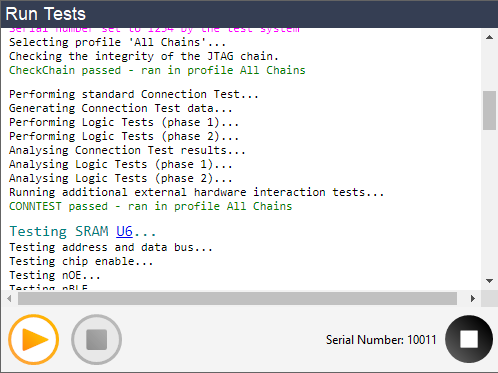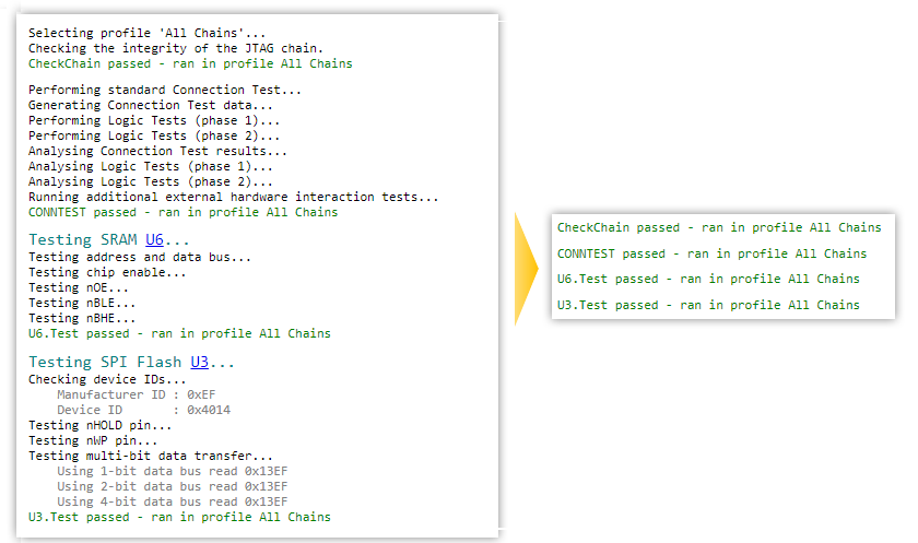 Test results can include status information on what the test is doing and hyperlinks to help with debugging as shown in Figure 2 below. This information comes from print statements in the XJEase code.