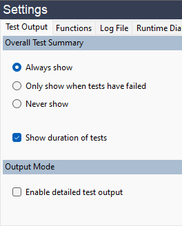 A configuration for when this summary box is displayed can be set via the radio buttons shown in Figure 3 above. It can be configured to always be shown at the end of tests, to be shown only if one or more of the tests has failed, or never to be shown.