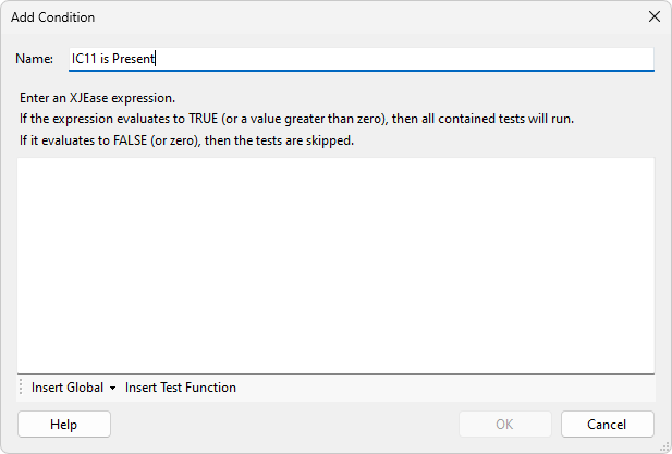 The condition is created in the Add Condition dialog by a mix of typing and inserting global functions and/or the results of previous tests: